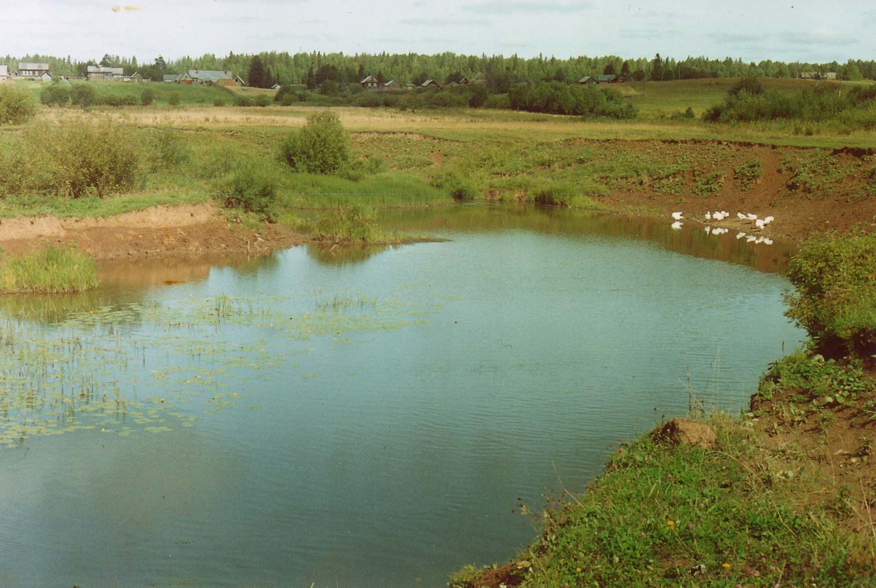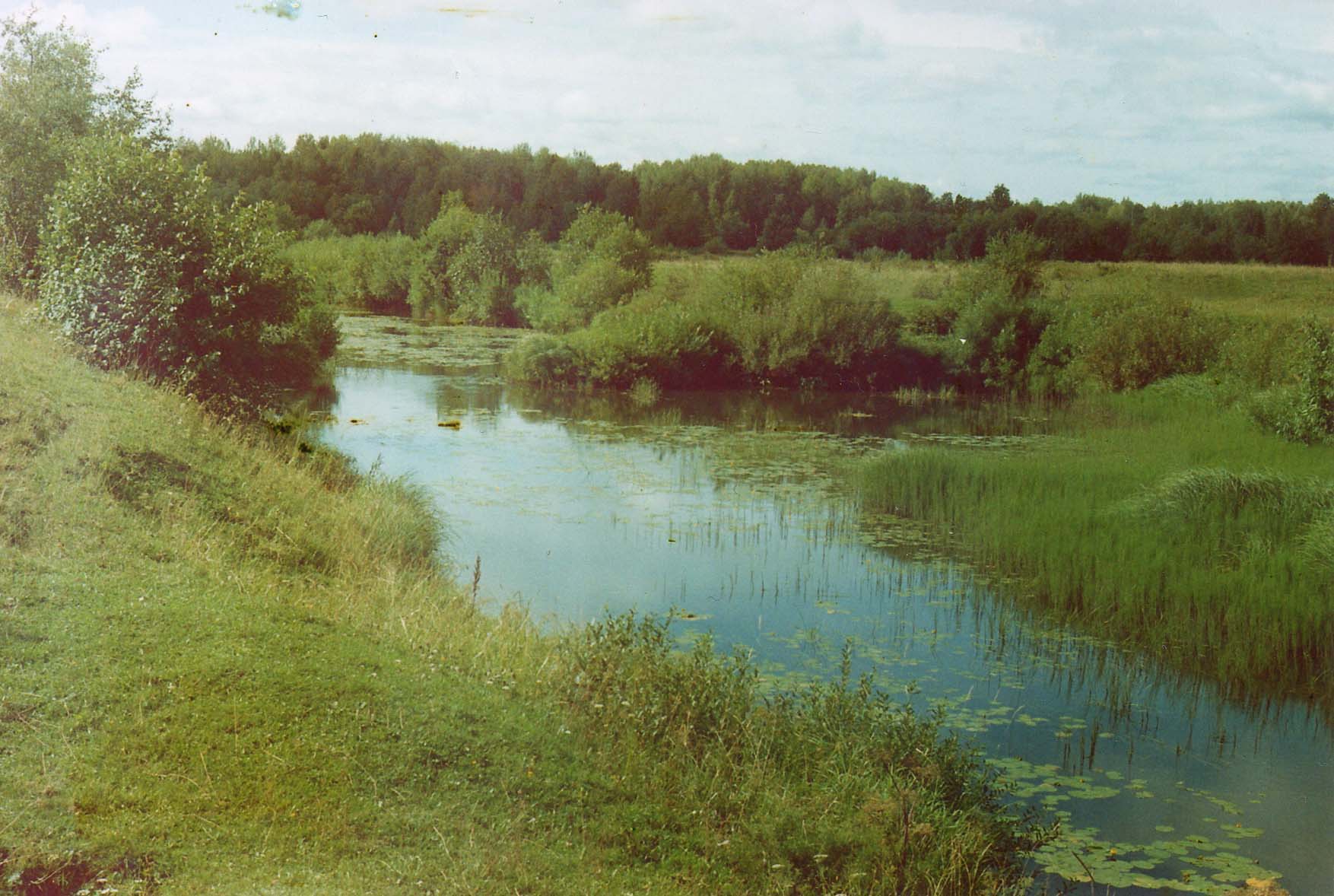 с корягами, берега топкие, заросшие осокой и ивняком. Часто