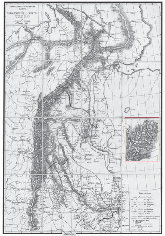 Topographical map Топографическая картаMount Poen-Urr (Narodnaya) on Antal Repuly's map 1847 г Поэн-Урр (Народная) на карте А Регули 1847